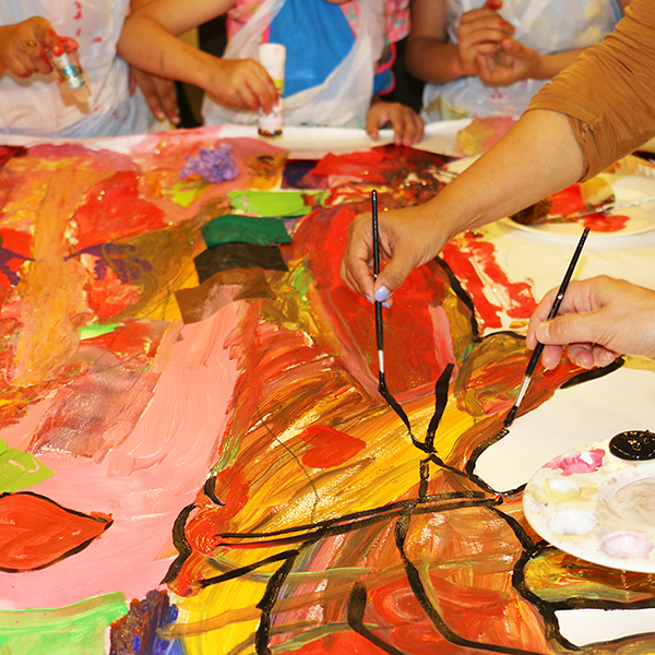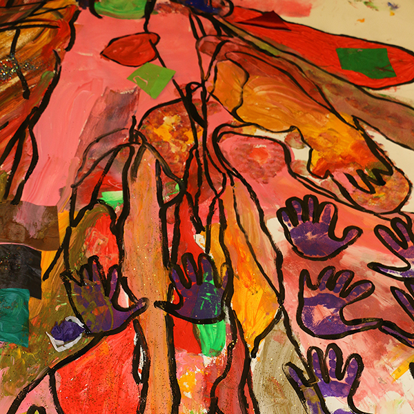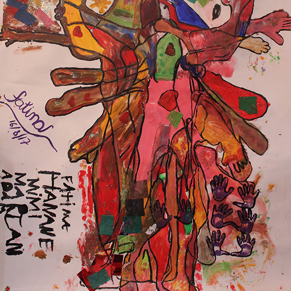 For our workshop with NOVA’s Grenfell families group, Emily Phillips had selected Ribeiro’s mystical paintings entitled ‘Divinities’ as an activity the families could do as one. Producing these larger-than-life paintings, the atmosphere in the room was Carnivalesque and they “enjoyed doing something together and having fun”.