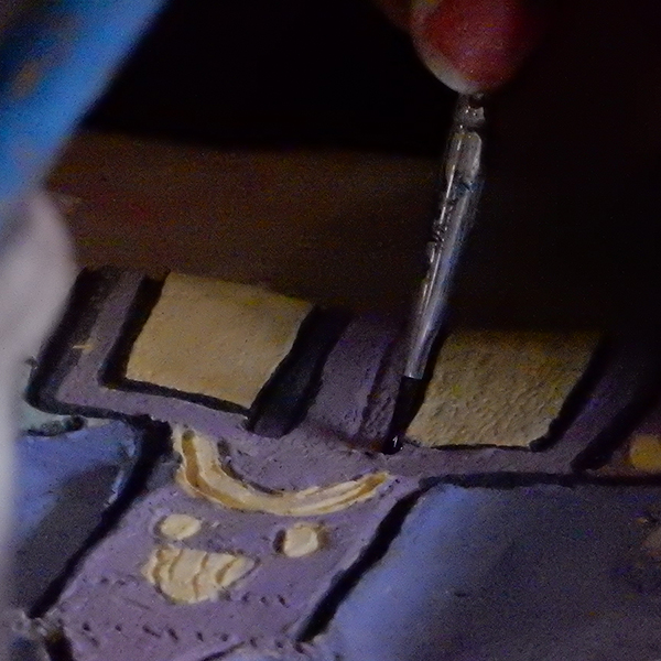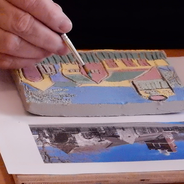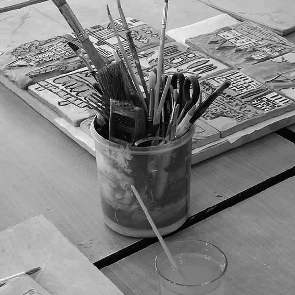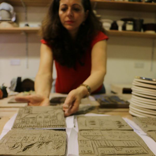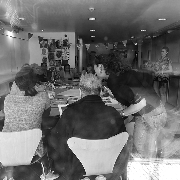 Ribeiro’s oil cityscapes, which bear the influence his ancestral home of Goa had for him, were used as a stimulus for the ‘Young@Arts’ Over 50s group. Artist Mürüde Mehmet had the group carve and paint ceramic tiles of places or buildings that had a personal resonance for them which acted as a reminiscence catalyst to draw out their stories. One lady revealed how she had been a child evacuee, “just told to turn up at either Euston or Kings Cross” with no idea of where they were being sent. Gesturing outside, she revealed bombs were falling everywhere. Another, carving out Bow Church, recalled her friend’s wartime wedding there, in a dress made from parachute silk.