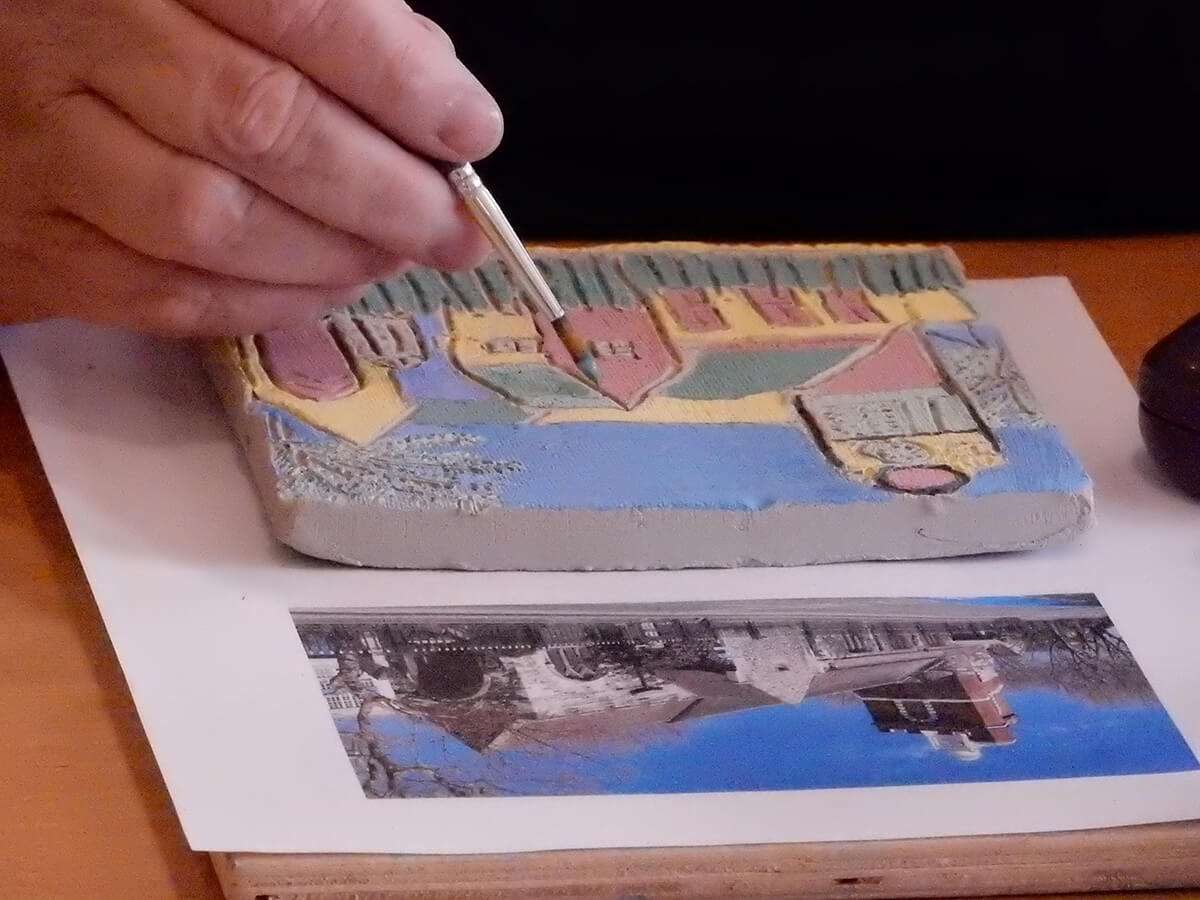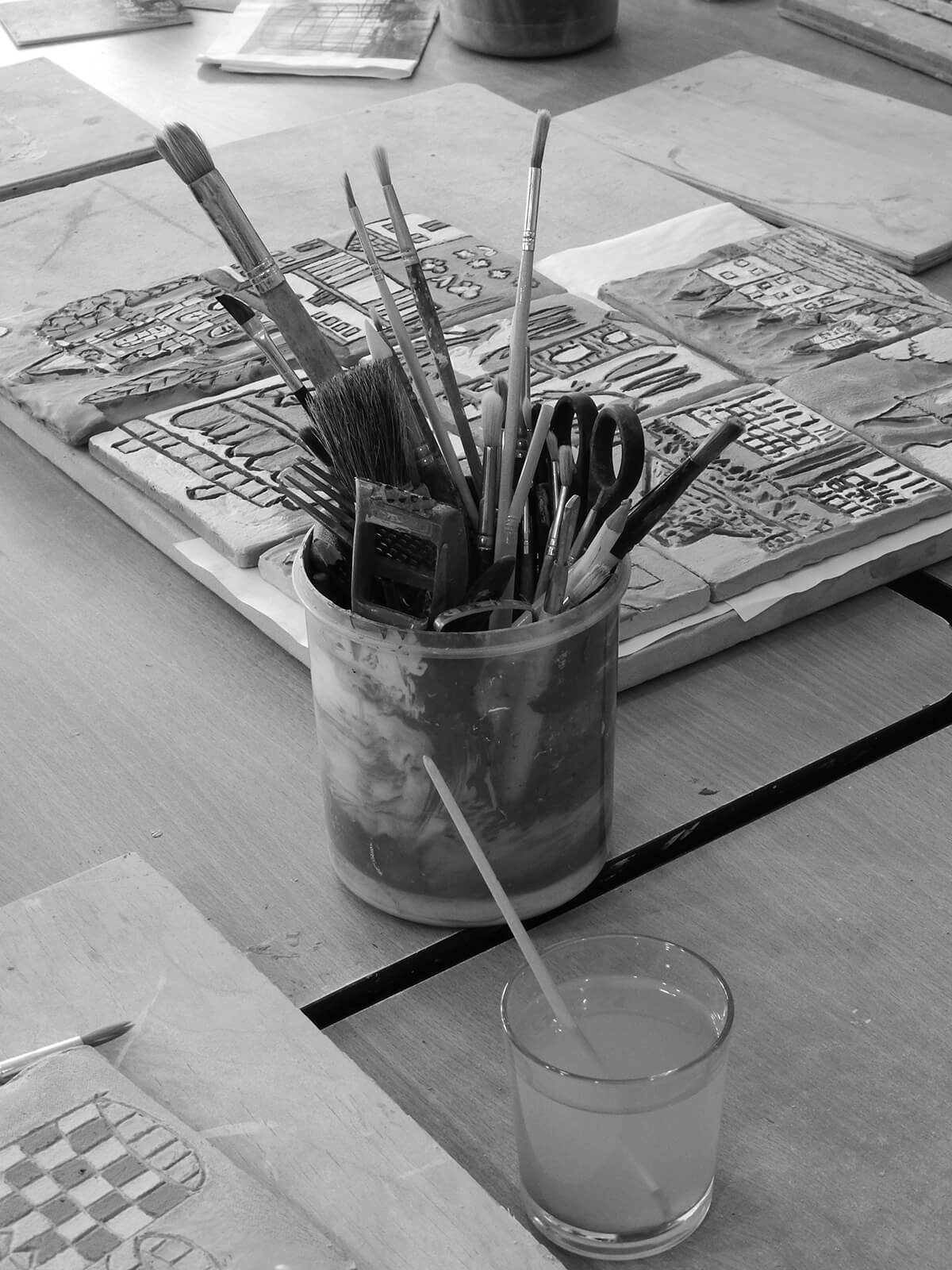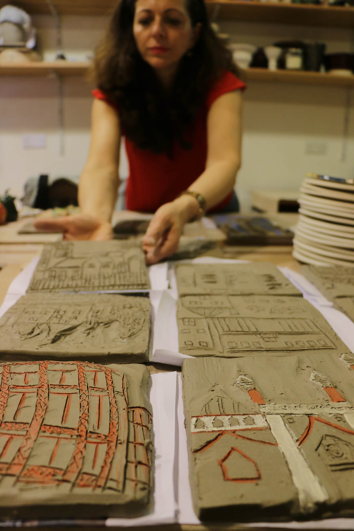 Ribeiro’s oil cityscapes, which bear the influence his ancestral home of Goa had for him, were used as a stimulus for the ‘Young@Arts’ Over 50s group. Artist Mürüde Mehmet had the group carve and paint ceramic tiles of places or buildings that had a personal resonance for them which acted as a reminiscence catalyst to draw out their stories. One lady revealed how she had been a child evacuee, “just told to turn up at either Euston or Kings Cross” with no idea of where they were being sent. Gesturing outside, she revealed bombs were falling everywhere. Another, carving out Bow Church, recalled her friend’s wartime wedding there, in a dress made from parachute silk.
