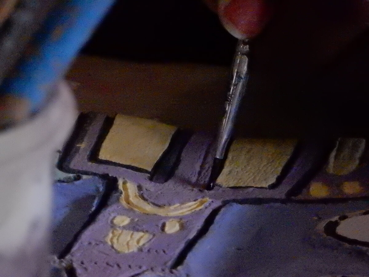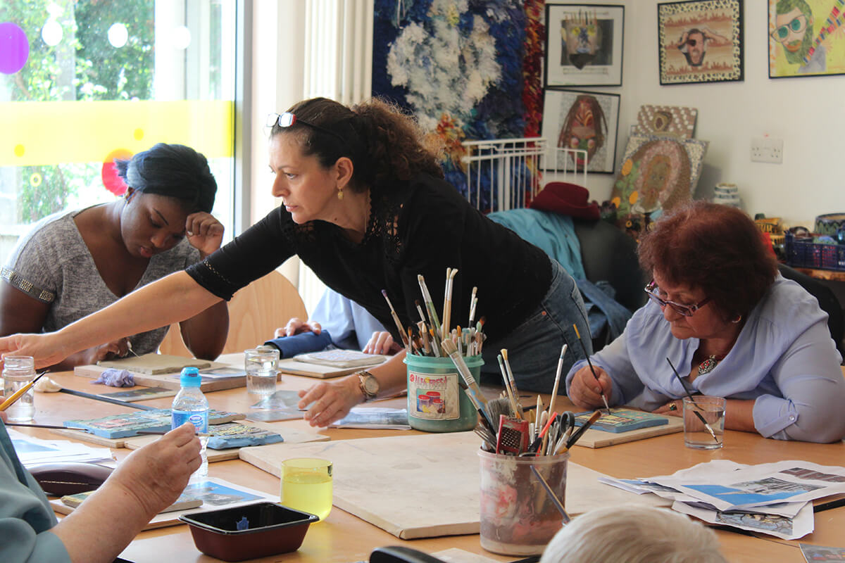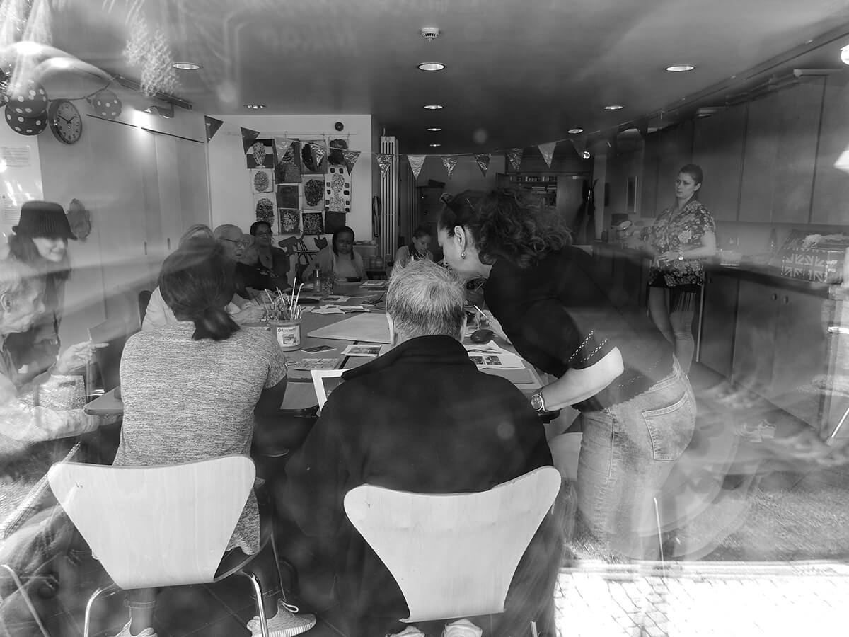 Ribeiro’s oil cityscapes, which bear the influence his ancestral home of Goa had for him, were used as a stimulus for the ‘Young@Arts’ Over 50s group. Artist Mürüde Mehmet had the group carve and paint ceramic tiles of places or buildings that had a personal resonance for them which acted as a reminiscence catalyst to draw out their stories. One lady revealed how she had been a child evacuee, “just told to turn up at either Euston or Kings Cross” with no idea of where they were being sent. Gesturing outside, she revealed bombs were falling everywhere. Another, carving out Bow Church, recalled her friend’s wartime wedding there, in a dress made from parachute silk.
